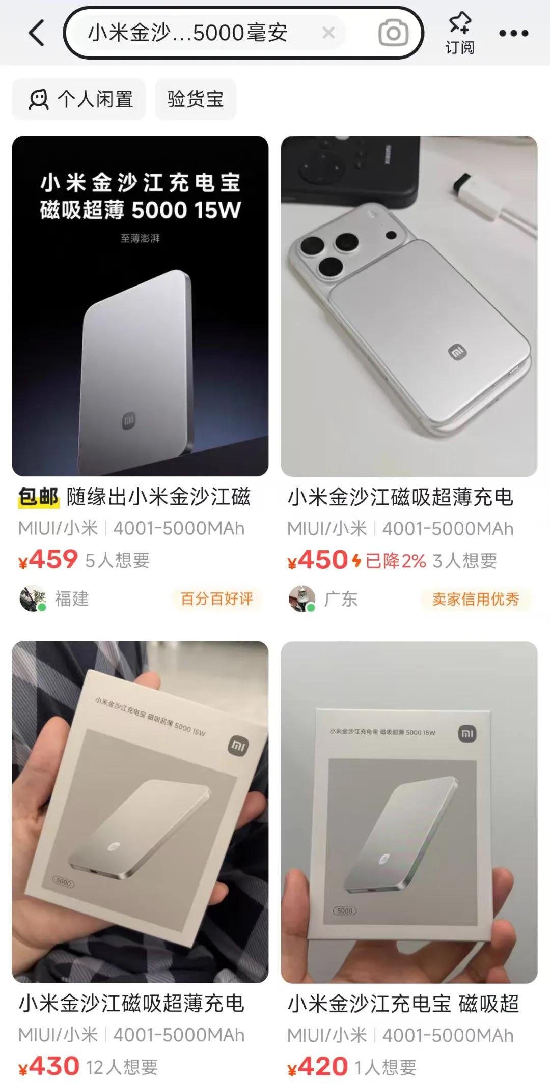 这款充电宝原价就不便宜,毕竟容量才5000mAh,但你猜咋地?现在它一货难求,现货被黄牛炒上天喽。根据我今天在闲鱼的搜索,全新未拆封均价是400元以上,最贵的一家是459元,溢价达到了160元。
