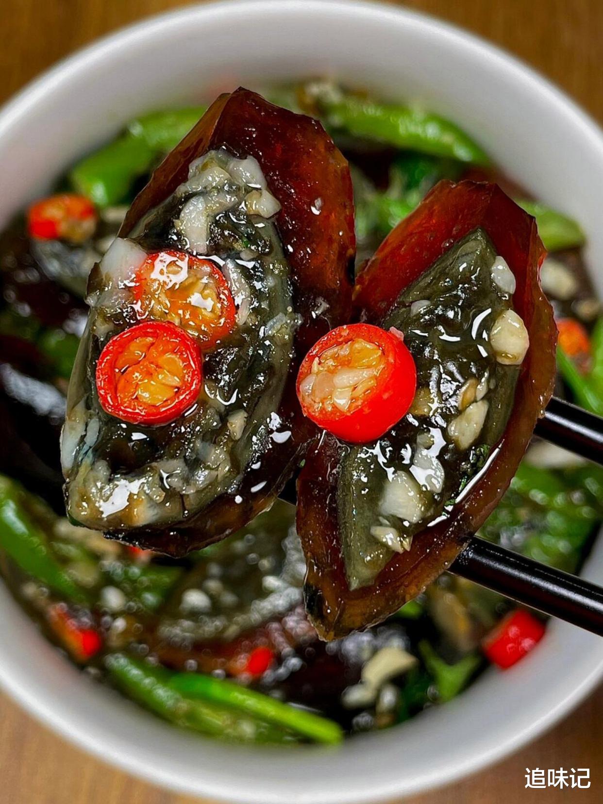 皮蛋Q弹有嚼劲,线椒的辣味和蒜香交织在一起,加上香菜的点缀,口感层次丰富,令人回味无穷。
