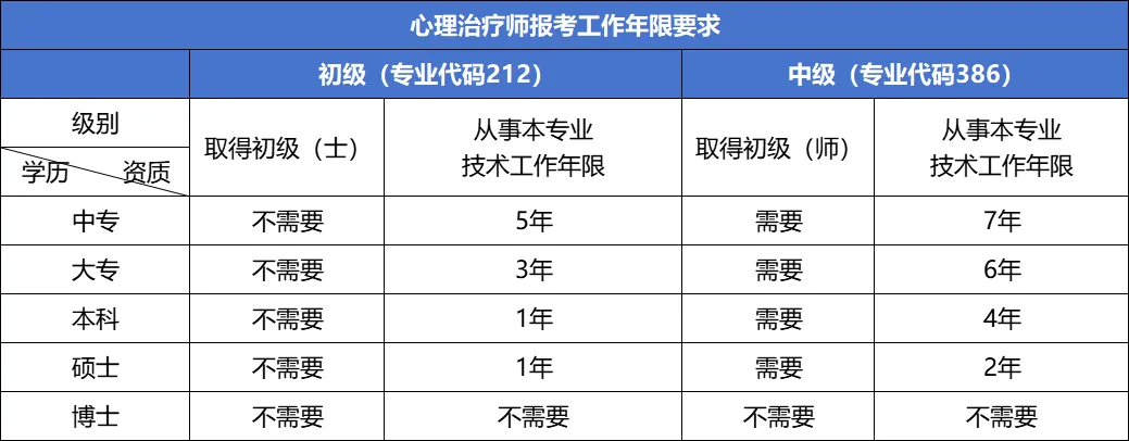 报考心理治疗初级学历及工作年限要求(符合以下一项)