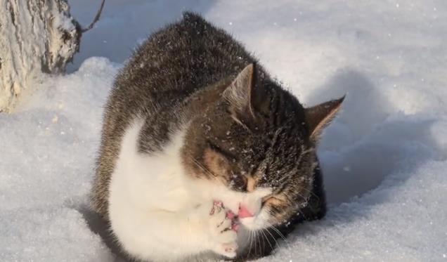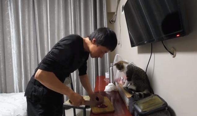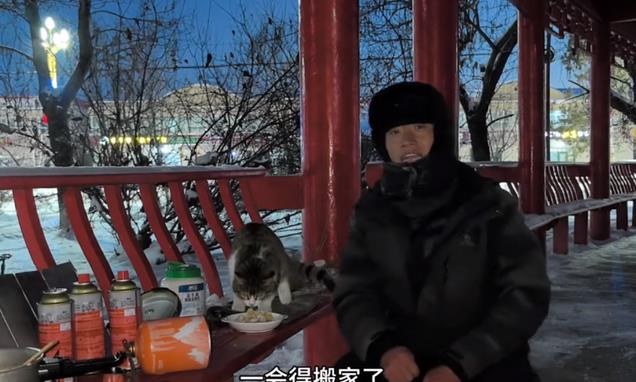 赵朔开始给悟空做猫饭,做完天都黑下来了,赵朔喂猫的时候说“一会得搬家了,下午的时候有人过来提醒这个地方太冷了,住在外面不安全,所以一会再往前走走”。