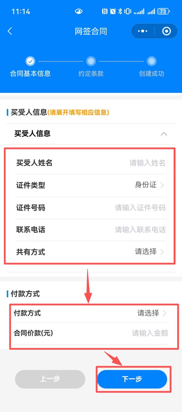 ②核对“房屋基本信息”、“出卖人基本信息”(通过点击小箭头“∨”展开查看),完善“买受人信息”,选择付款方式,输入付款时间和合同价款后,点击“下一步”按钮。