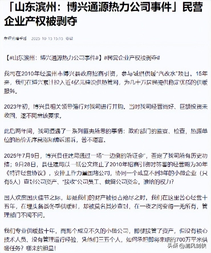 第三式:2025.9.29日,公安、特警人员、博兴县公用事业集团下属的博兴县恒通热力有限公司查封查扣恒源和通源。10.15日,有自称通源通源热力公司员工针对此事在网上发文。