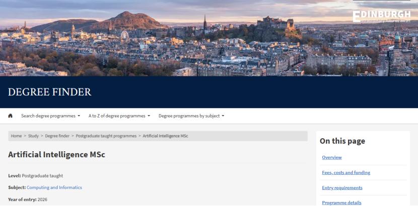 信息学院开设的人工智能硕士Artificial Intelligence MSc课程,在英国历史最悠久的人工智能学术中心授课,提供全日制1年和非全日制最长3年的授课模式。许多课程将由国际知名的研究人员讲授,他们涉足人工智能的广泛领域,并借鉴了神经科学、认知科学、语言学、数学等相关领域的研究。