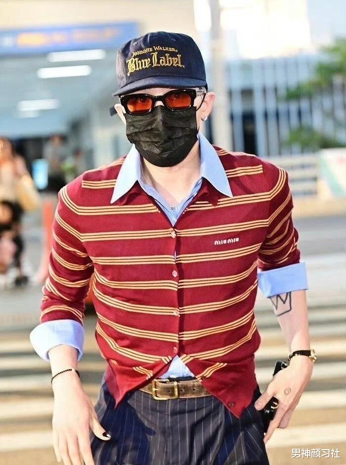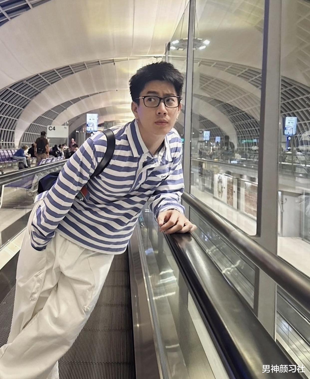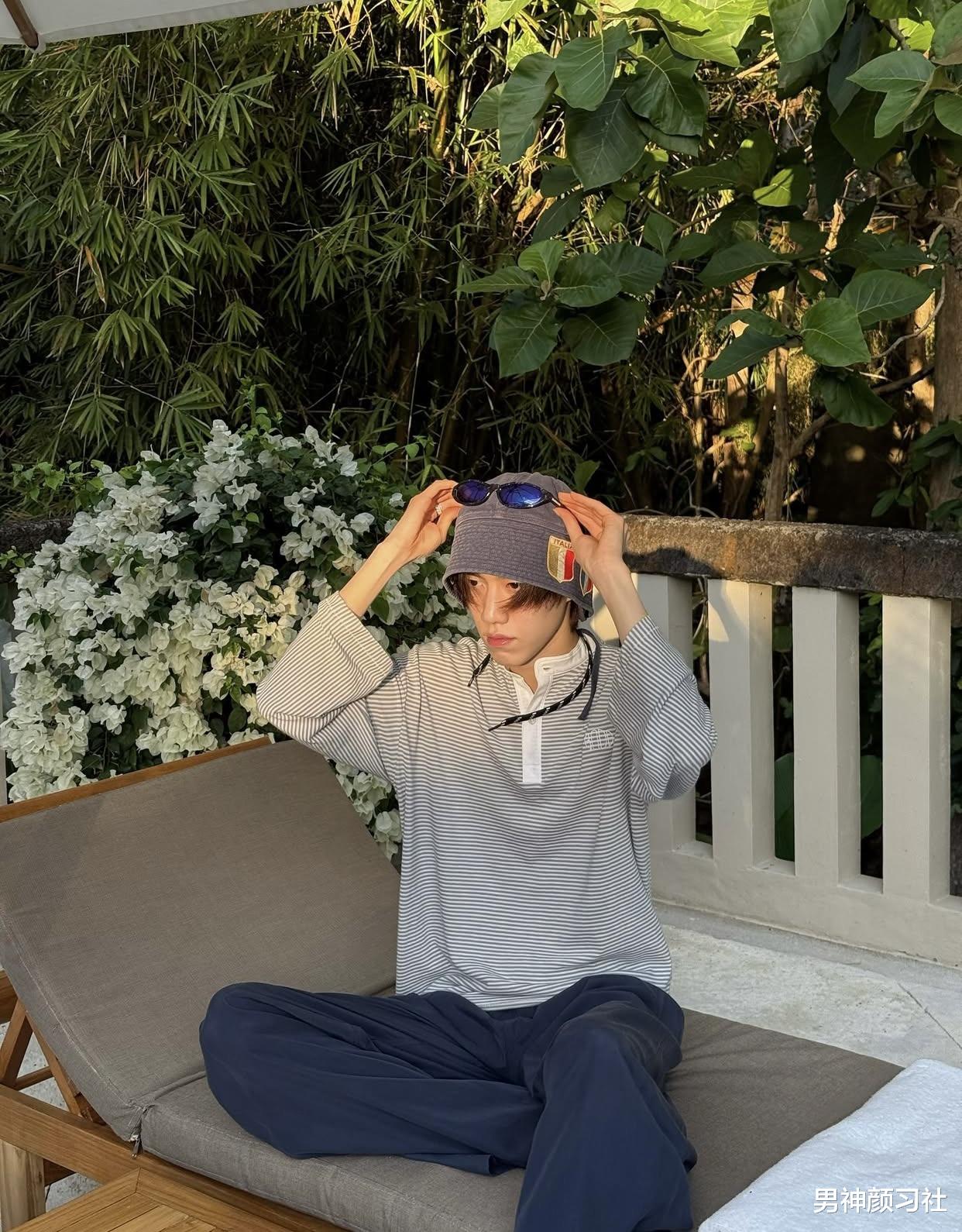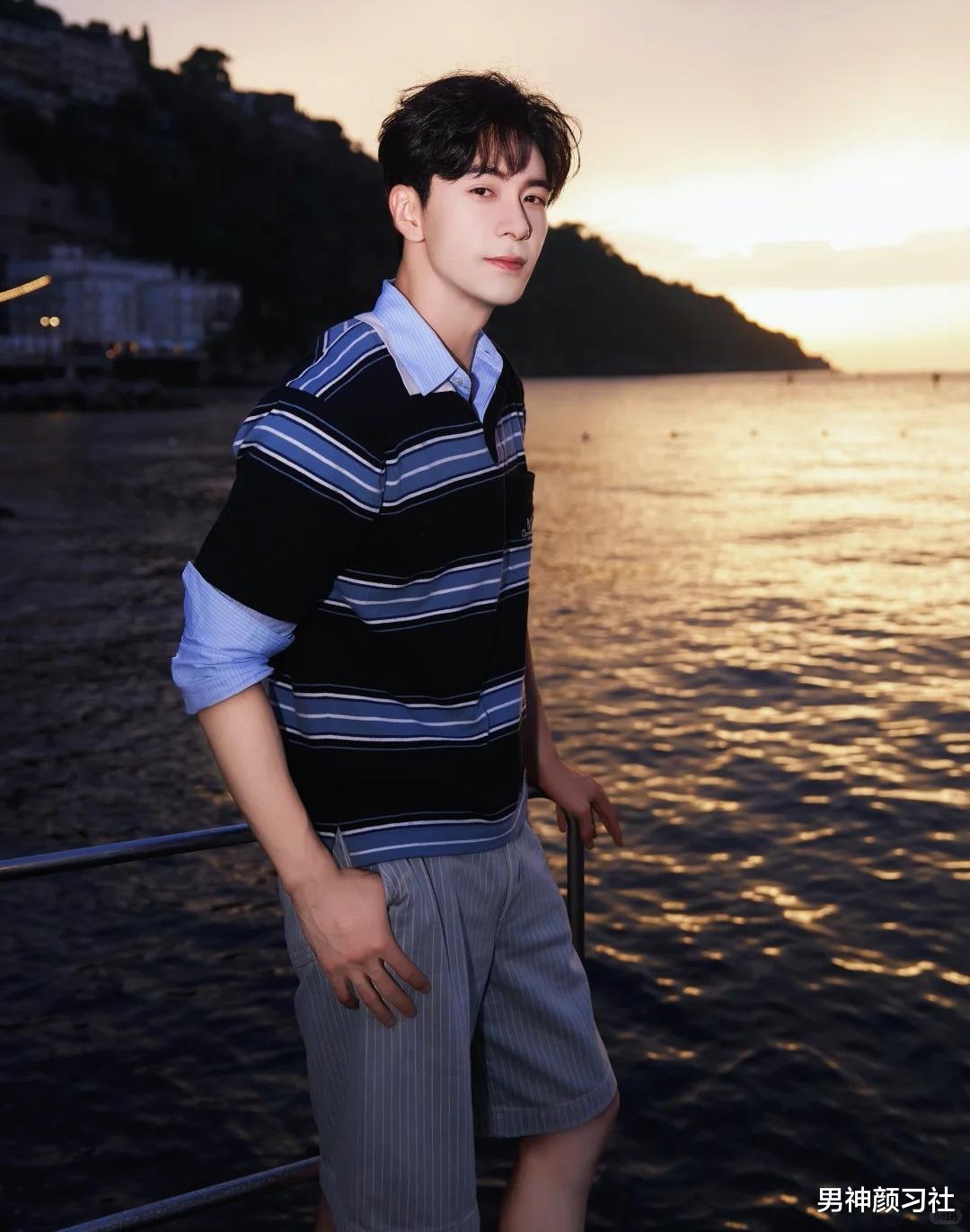 条纹西装长裤也可以换成短的,显得更加温柔一点。他的风格本身就是偏公子哥的,在单品的选择上就特别合适。上半身用条纹衫和蓝色衬衫玩了一个叠搭,很出彩。