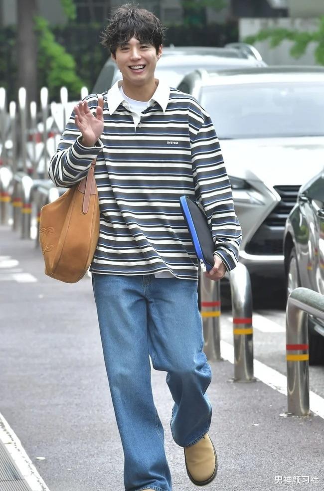 朴宝剑之前的这身也蛮有风格的,很适合打造秋冬的暖男。而且,因为他的条纹衫看着比较大,所以还在里面叠穿了一件白色短袖,这样全身更有层次感,look也更有精神了。