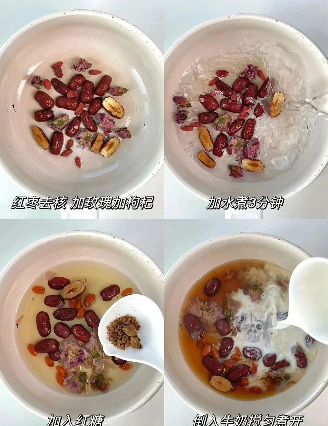 红枣、玫瑰花、枸杞、红糖、牛奶