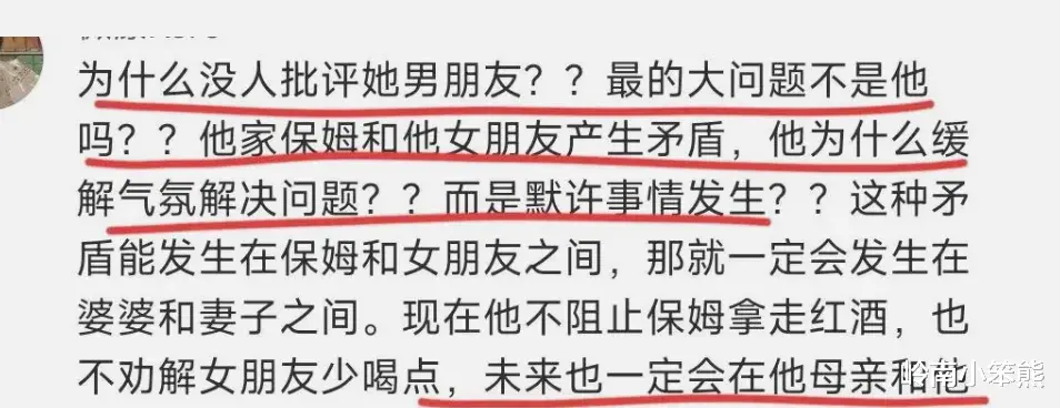 甚至还有网友觉得男朋友不作为才是大问题。如果男朋友重视女朋友,就会提前叮嘱保姆女朋友喜欢吃什么,喜欢喝什么。