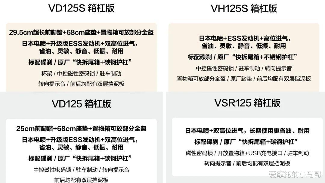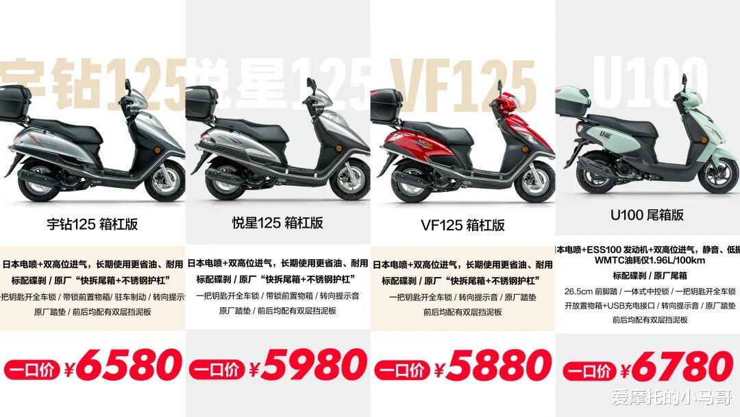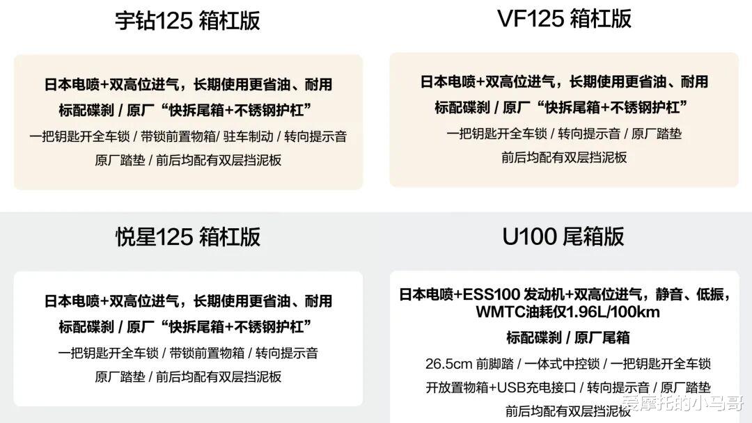 这四个版本价格相对来说更低一些,同时排量也要更小一点,优势就是更省油,尤其是U100的百公里油耗只有1.96L,这样尽管它们的油箱只有6L左右,一箱油也能跑个接近300公里。