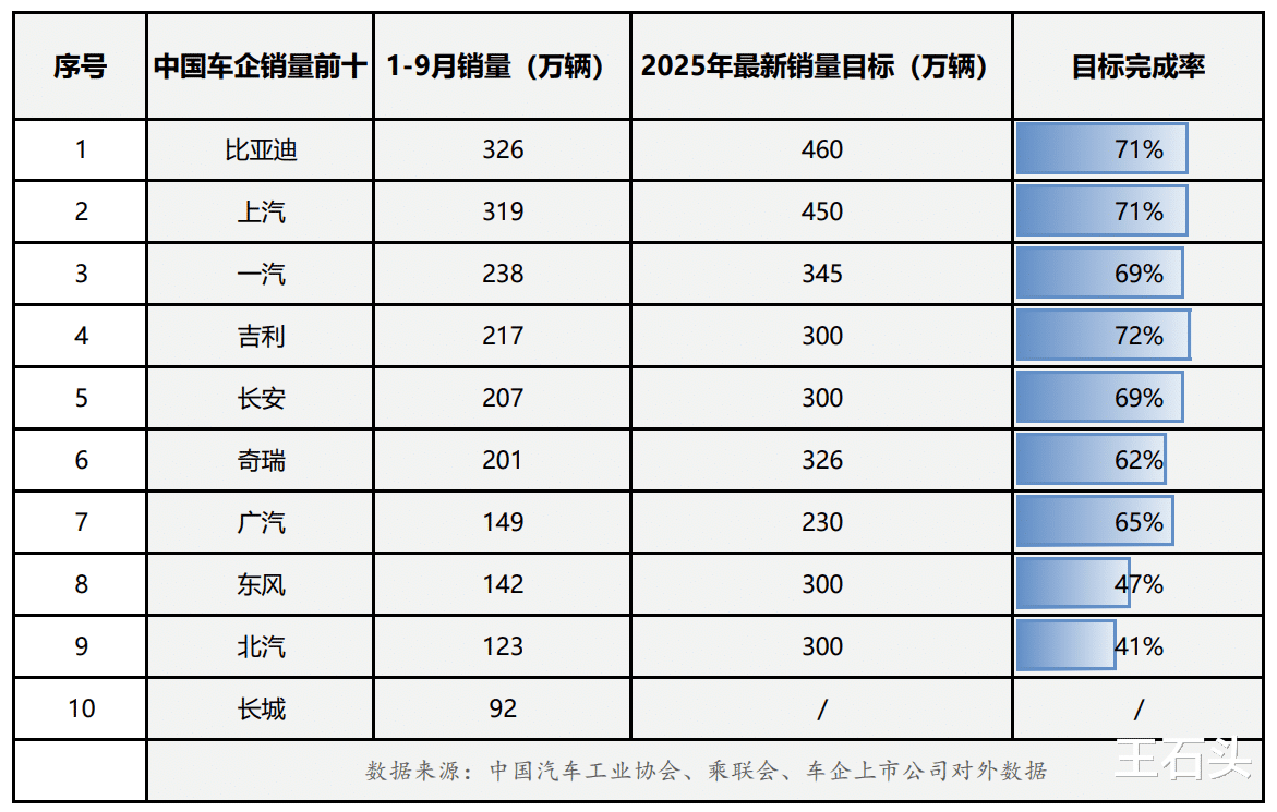 头部车企在累计销量及全年目标完成率上呈现出明显分化,比亚迪、上汽和吉利以超过70%的目标完成率位居前列,而其他车企也在奋起直追。