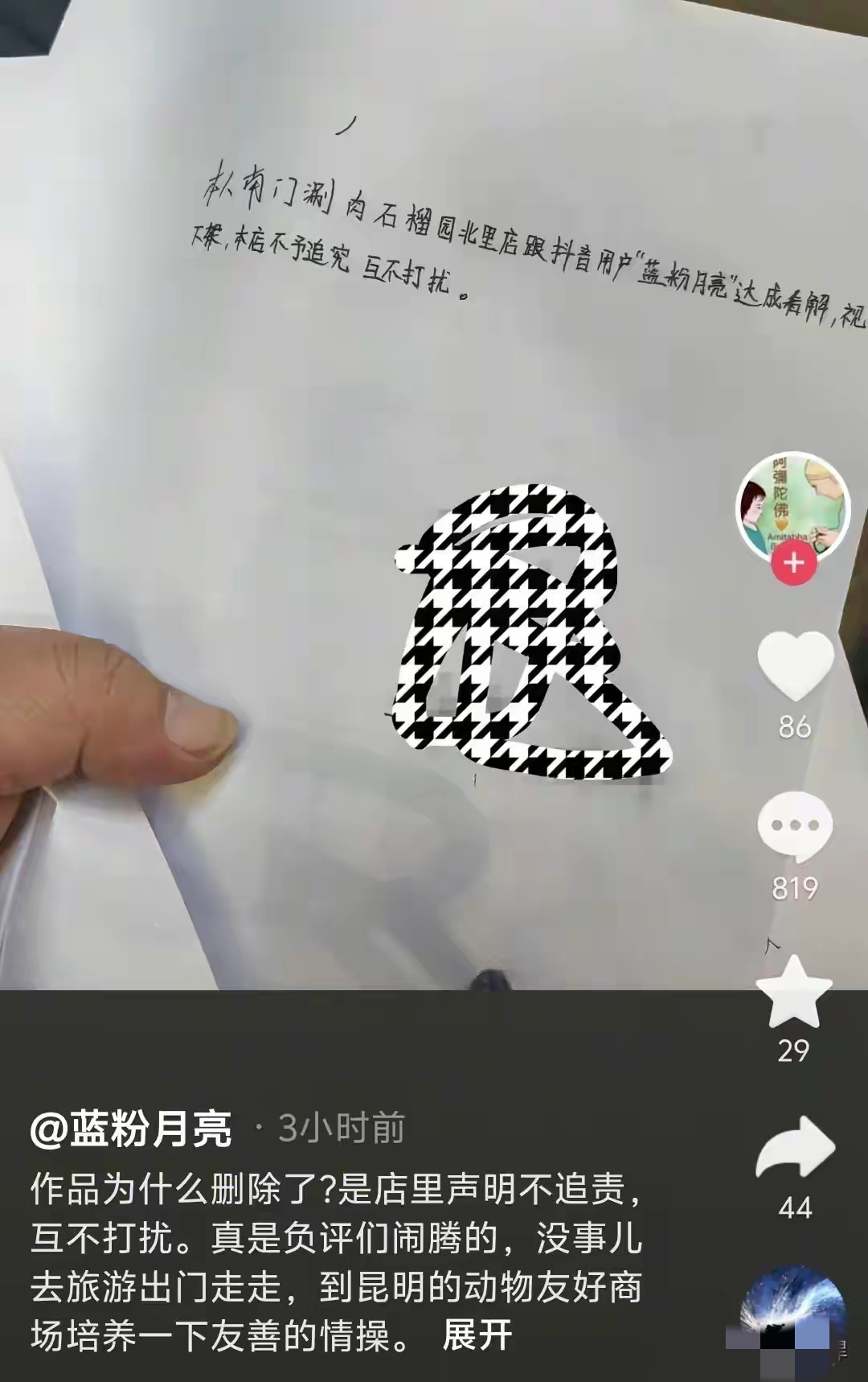 不过12月19日,狗主人在抖音上发布了一份和解协议,上面写着“本人南门涮肉店石榴园北里店跟抖音用户蓝粉月亮达成和解,视频下架,本店不予追究,互不打扰。”