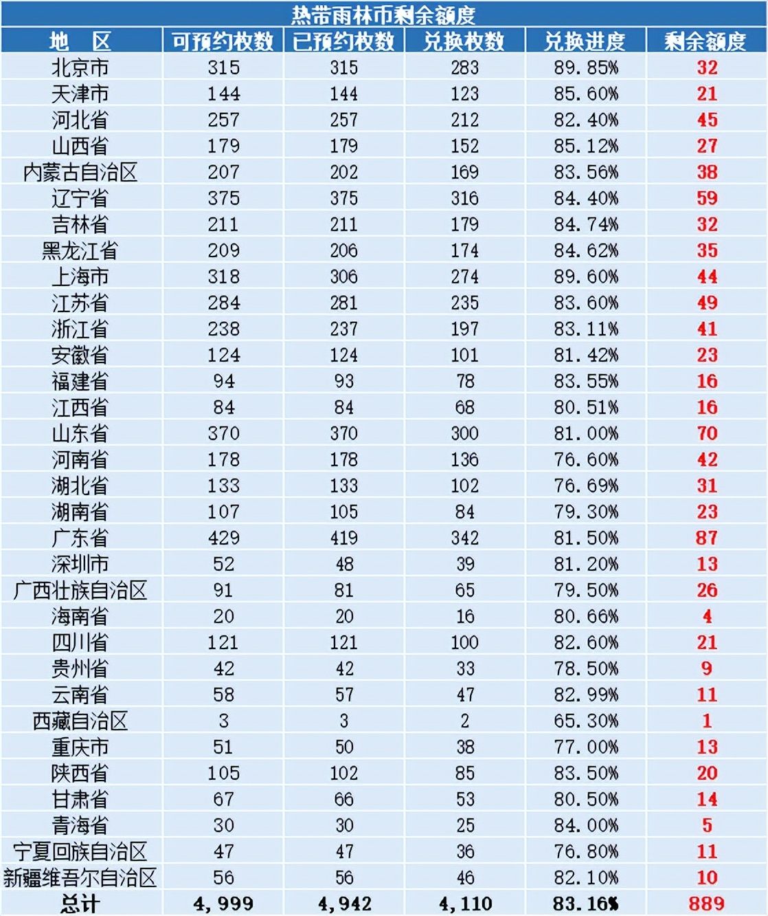 在7天兑换后,雨林币的兑换进度为81.8%,全国一共有955万枚被放弃预约和兑换。