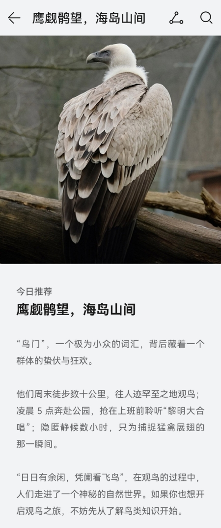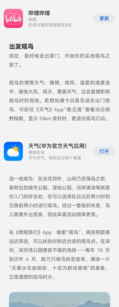 拿常用的《今日推荐》栏目来说,这个栏目有意思的是,比如“鹰觑鹘望,海岛山间”的主题,开头是科普性的文字说明,就蛮吸引人的。接着是和鸟相关的APP推荐,并且每个不同的APP都有介绍,比如喜马拉雅APP会引申到不同鸟类的鸟儿声,满足用户的好奇心;哔哩哔哩APP则会引申到《鸟类星球》等纪录片,让用户可以通过视频直观了解鸟类的习性和生活环境;华为官方天气应用则会有观鸟时间、观鸟点相关的信息,可以说是相当全面了。