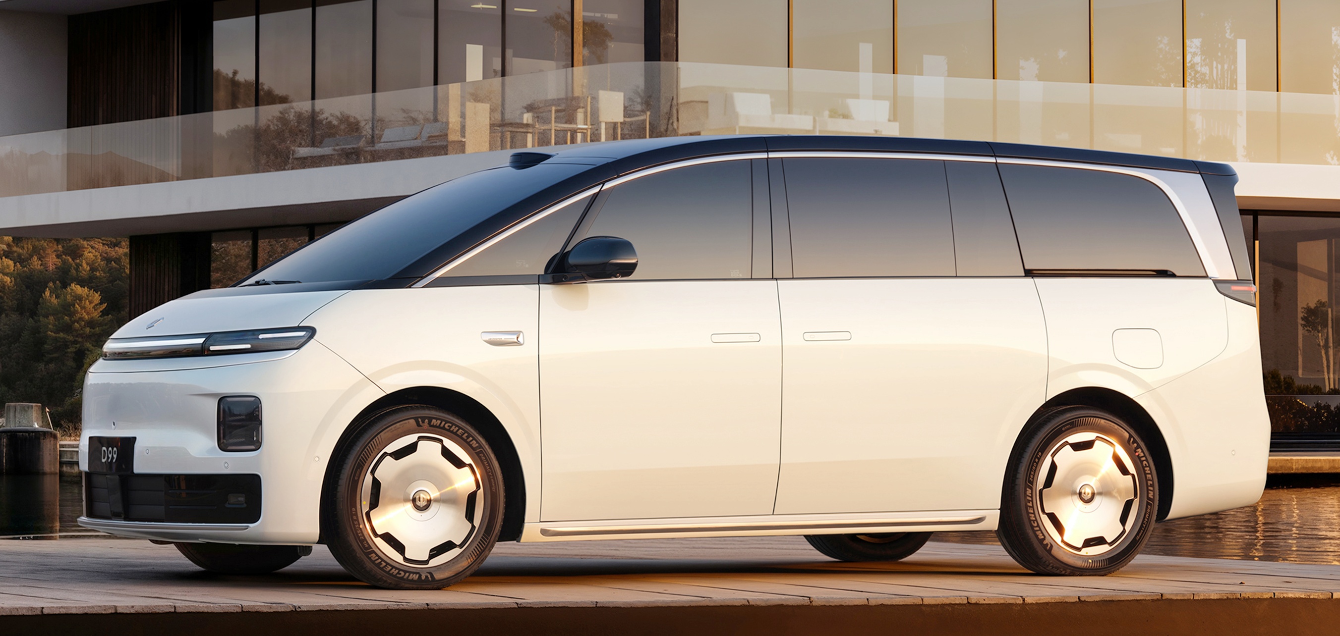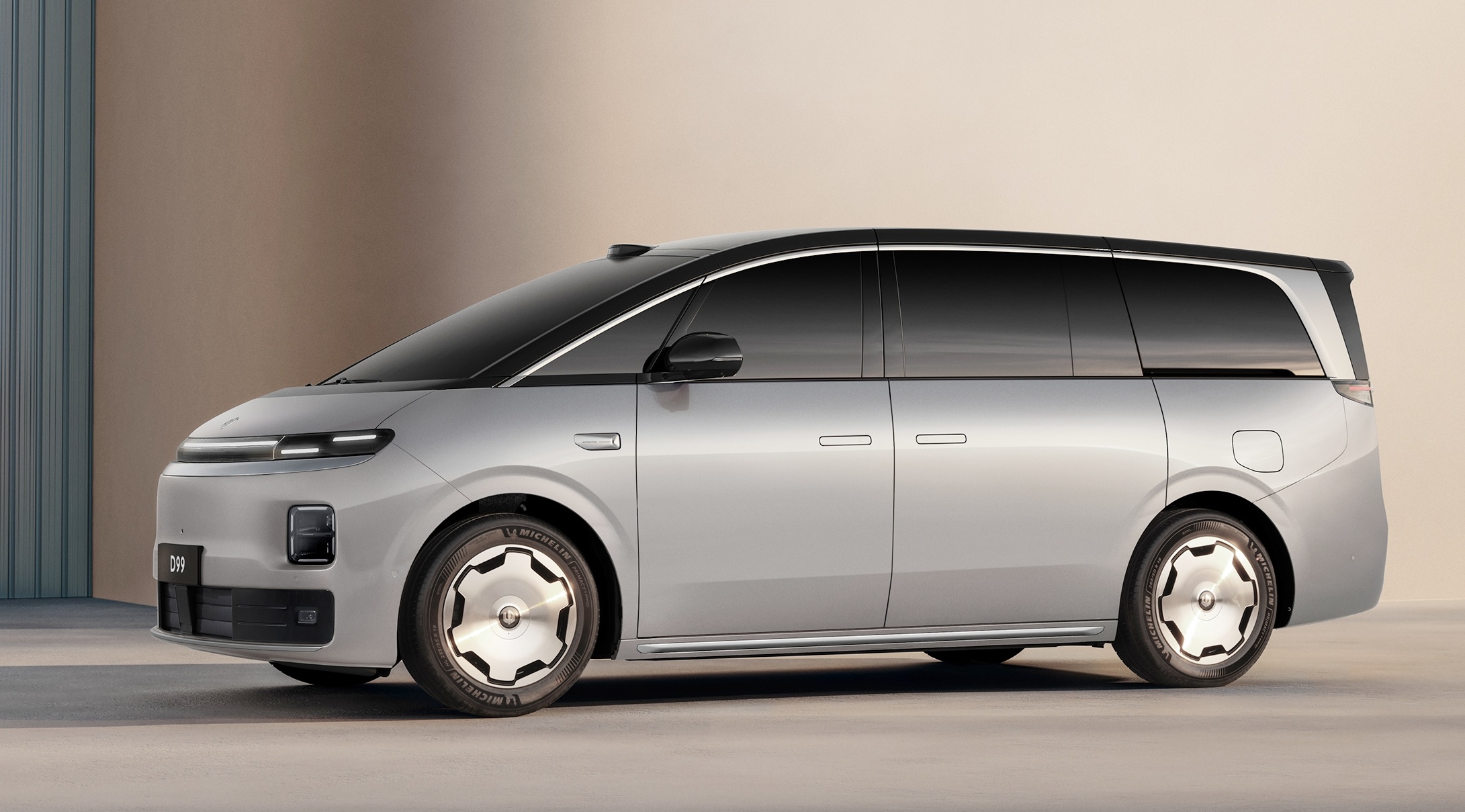 车身侧面,零跑D99采用短前悬,但拥有较长的后悬与轴距,银色的装饰勾勒出新车车窗的线条,后排侧滑门尺寸更大,上下车更加方便,同时采用隐藏式滑轨设计。新车配备“向往之境”饼型轮圈及米其林静音轮胎。尺寸方面,新车的车身长度超5.2米,车宽接近2米,而轴距则是超过3.1米,足以营造舒适的车内空间。