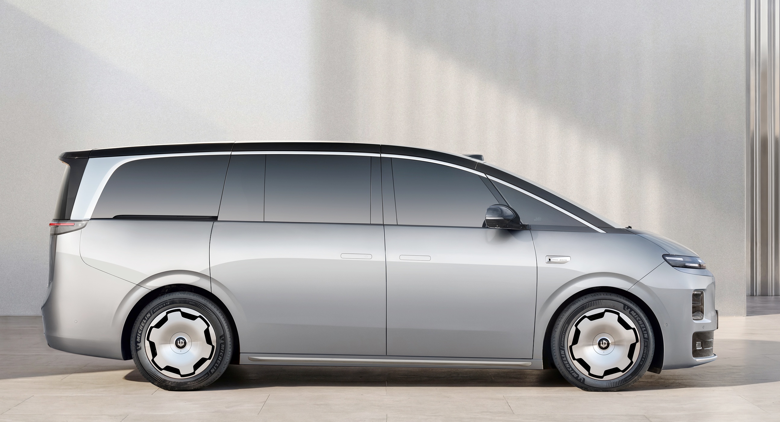 新车车身侧面设计简洁,配备隐藏式车门把手和21英寸密条辐式轮毂或“大饼式”轮毂可选,匹配米其林轮胎(轮毂规格为265/45 R21),整车气场非常强。车身尺寸方面,零跑D19的长宽高分别为5252毫米/1995毫米/1780毫米,轴距为3110毫米,提供6/7座可选。车尾则延续简约风格,采用贯穿式尾灯设计,集成ISD智慧交互灯幕,含11025 颗LED灯珠,支持多场景智慧灯语。