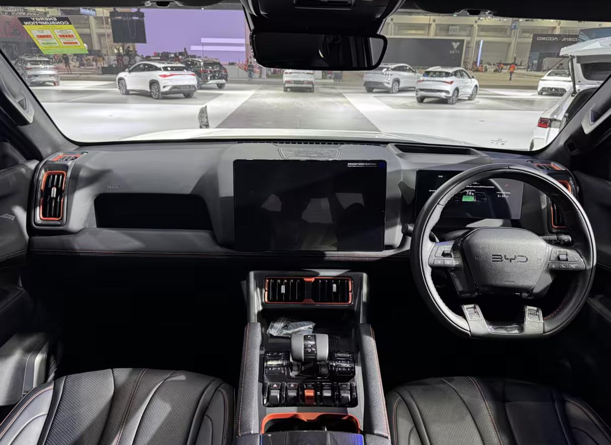 比亚迪SHARK的内饰则是由米开勒·帕加内蒂研发打造的,大面积黑色Nappa真皮材质通过红色的双缝线进行完美的缝合,空调出风口四周加入了橙色元素点缀,门把手、中央扶手箱还增添了银色金属元素和亮黑色钢琴烤漆装饰面板点缀,配备了四个真皮沙发座椅,主驾驶席配备6向电动调节、座椅加热和通风,还提供了50W手机无线充电、智能语音、540度全景影像以及唱吧功能。科技感方面,中控台配备了可旋转的12.8英寸中控屏,四辐式方向盘前方配备10.25英寸液晶仪表,还提供12英寸W-HUD抬头显示屏,支持Apple CarPlay/Andriod Auto手机互联、6个安全气囊以及L2级驾驶辅助功能。前排座椅的靠背还可以一键放倒,可以瞬间变成两个单人床,实用性很强。