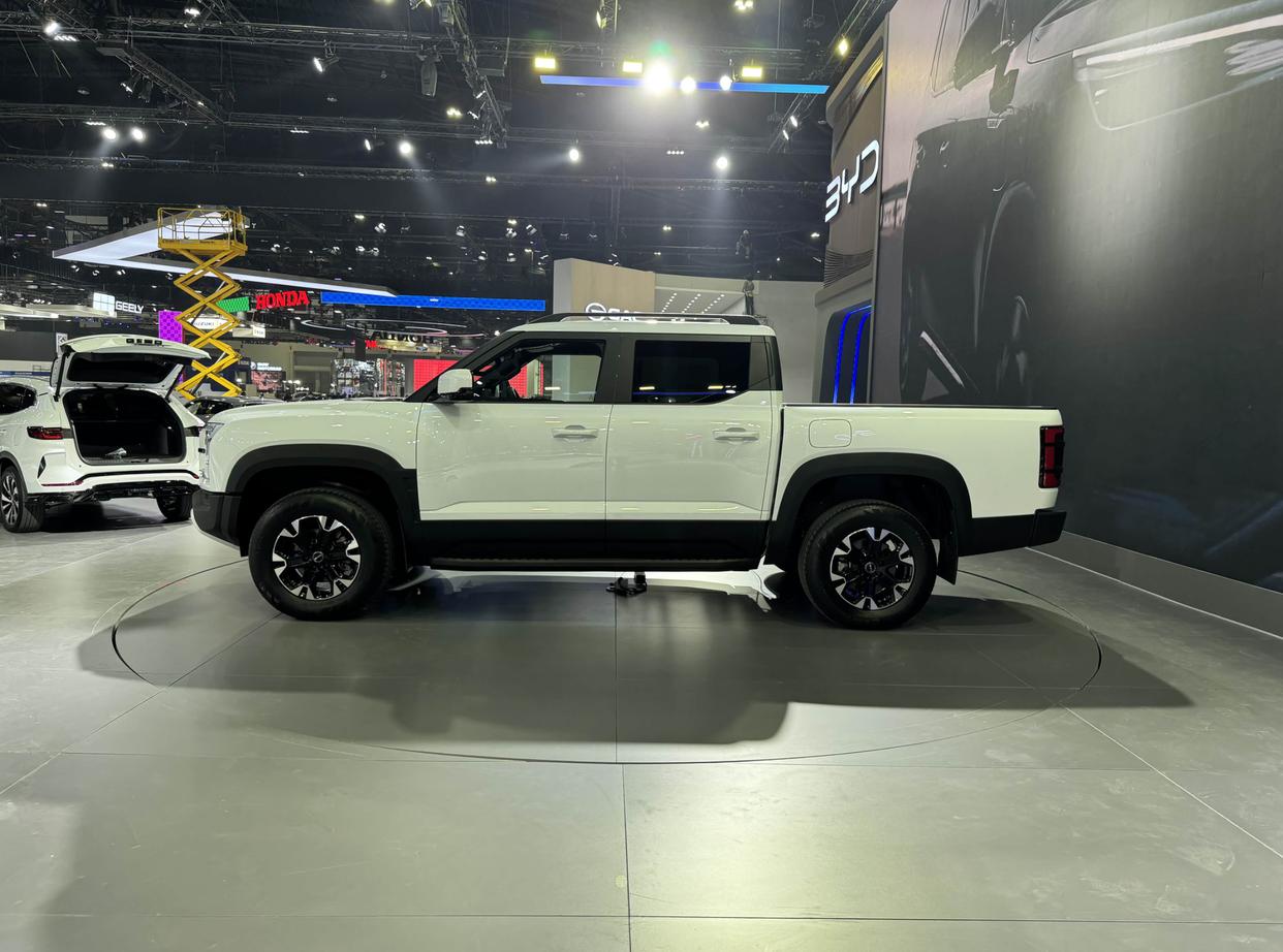 比亚迪SHARK的车身采用了双排的经典设计,车顶配备了黑色的全尺寸行李架,A/B/C柱也采用了同样的黑色饰板,并配备宽厚的黑色前后轮眉与翼子板,且形成了宽体的视觉效果,也增添了更丰富的层次感。18英寸的轮圈采用了半封闭式的结构,既能拥有更好的公路性能(原厂配备了佳通越野HT71系列的265/65 R18规格的轮胎),也可以带你跋山涉水、翻山越岭(支持35英寸的专业越野AT胎)。车尾是一个露天的货厢设计,底部和侧墙配备了防爆漆,增加耐用性。后货箱则拥有1450L的货箱容积。车尾灯也采用了类似门框的设计,黑色灯罩内部融入了醒目的红色光源,辨识度很高。车身尺寸方面,新车长宽高分别为5457/1971/1925mm,轴距为3260mm,这个表现中规中矩。