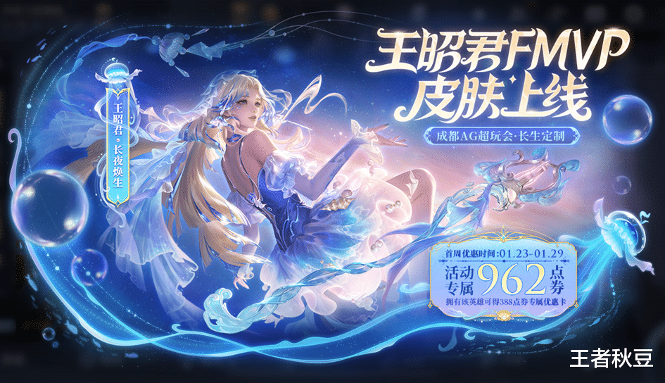 王昭君-长夜焕生将于1月23日开始上架商城,传说品质,是2024年年度总决赛FMVP皮肤,首周价格1350点券,如果拥有王昭君英雄可获388专属优惠券,首周活动专属价格最低962点券,首周结束后将恢复1688点券。