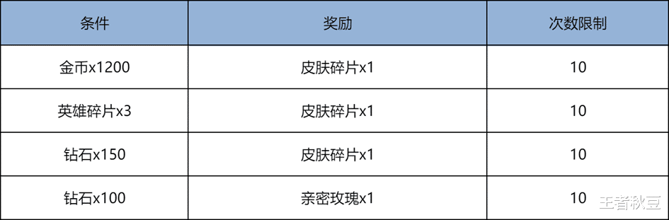 两个活动一共可以最多获得共45个皮肤碎片。再加3个就能兑换鲁班七号的新皮肤,一直没用的金币钻石和英雄碎片也终于有用武之地。具体的兑换条件和奖励和限制次数如下:1200金币换一个皮肤随,三个英雄碎片换一个皮肤碎片,150钻石换一个皮肤碎片。