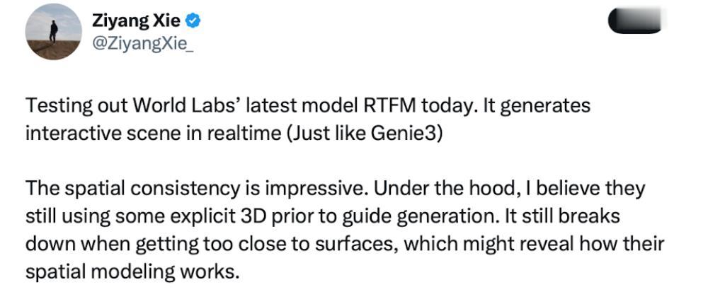 AI数据平台公司Manifolds AI联合创始人Ziyang Xie体验后称,RTFM的空间一致性令人印象深刻,但速度过快时仍然会崩溃。