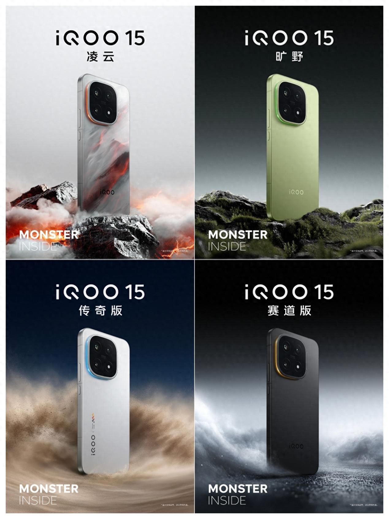 iQOO 15在外观上延续了硬核美学风格,提供凌云、传奇版、旷野、赛道版四款配色,满足不同用户的审美偏好,其中传奇版采用全新三色纹设计,致敬F1赛场旗帜,搭配全哑光机身与低温感哑光中框,质感出众且防滑不沾指纹,6.85英寸的直屏设计配合更大R角,兼顾视觉沉浸感与握持舒适度,横握游戏时不易硌手。
