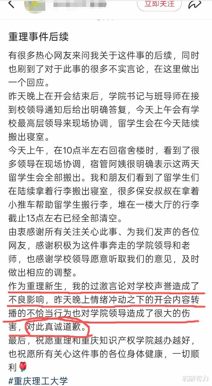 校方值得表扬的一点是:整改速度真是快,从女生发帖到留学生搬离,用时不到24小时。