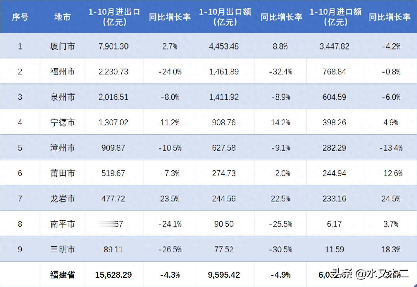 从同比来看,厦门市前10月进出口总额实现了2.7%的同比增长,增速虽然不算高,却高出全省平均不少,表现相对较好,也进一步拉开了与其他地市之间的差距,为全年实现万亿突破奠定了基础。