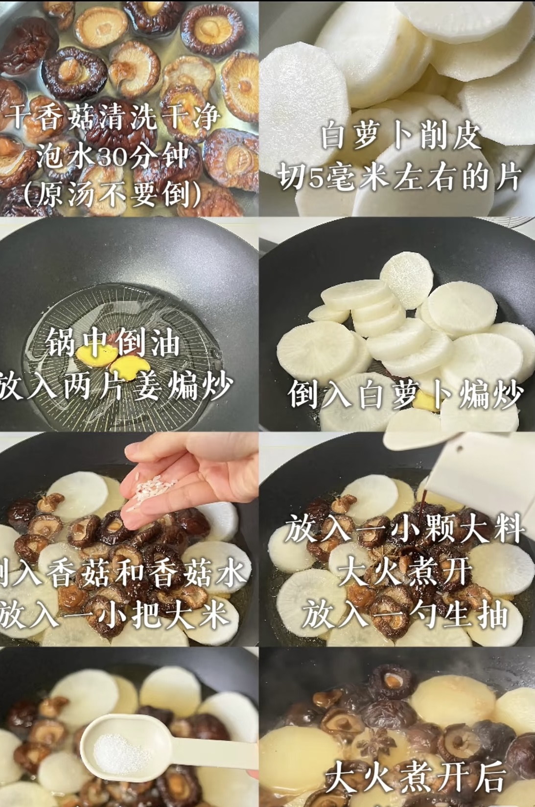 首先,我们需要准备一些基本的食材:新鲜的白萝卜、干香菇、姜、大料和一些调味料。白萝卜去皮后切成大约5毫米厚的片,这样既能保持口感,又能确保在烹饪过程中充分吸收汤汁的味道。干香菇则需要提前30分钟用清水泡发,泡发后的香菇水不要倒掉,因为这是制作汤底的关键。