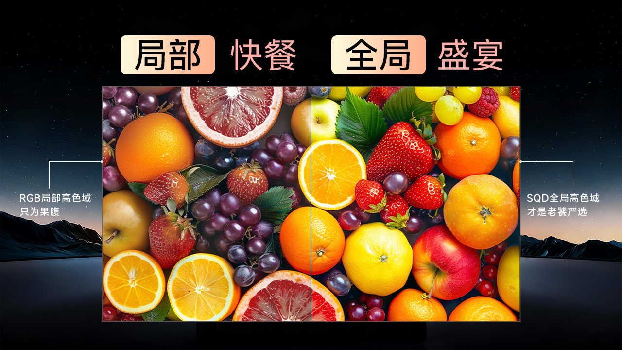可以说在同样的画面情况下,RGB-Mini LED电视受制于底层逻辑缺陷,不是偏色就是串色,画面灰蒙蒙的毫无生气可言;但SQD-Mini LED电视却能做到每种色彩都通透、纯正,画面也极具质感与张力,隔着屏幕都能感受到那股鲜活感。这对传统RGB-Mini LED电视形成了全方位碾压——全局,是终极解决方案;局部,只是色彩的折中妥协。