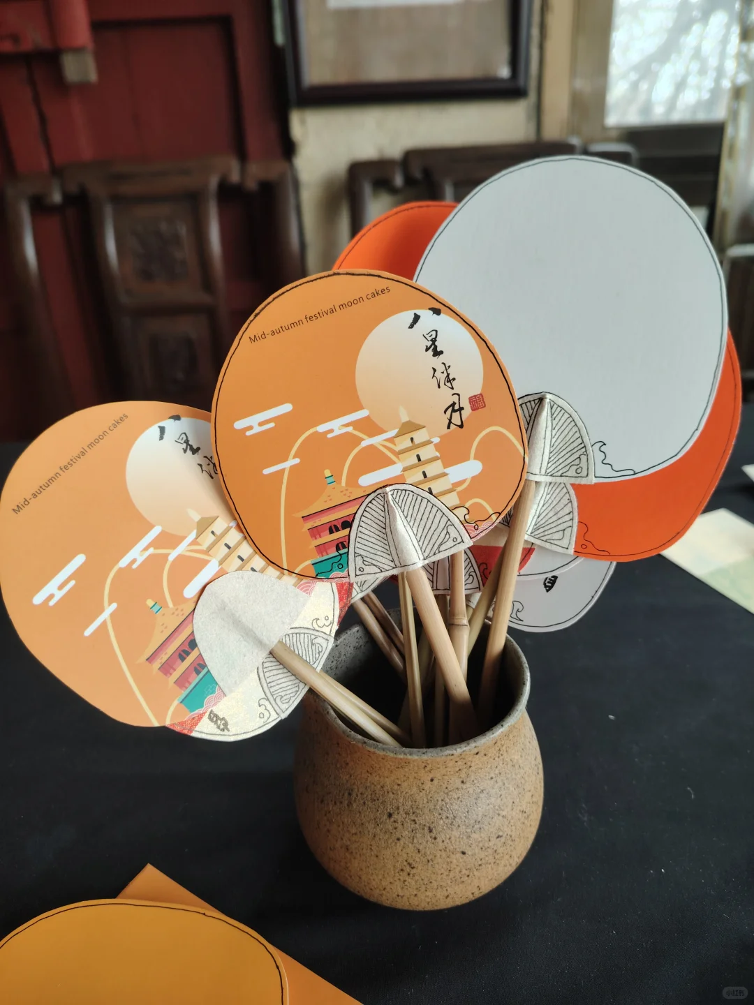 用一次性筷子打好底之后,我们再把闲置的月饼盒上你喜欢的图案裁剪下来,再用胶水粘贴到支架上,一个简简单单的古风扇子就做好了,放在家里当做装饰品也超好看。