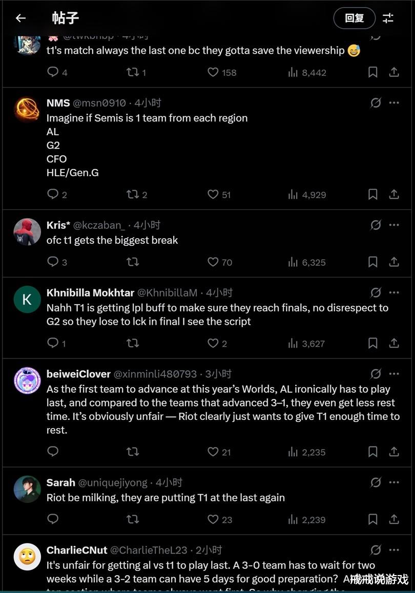 关于为什么总是把T1放在最后,玩家们主要持两种观点。一部分玩家认为这是为了让T1获得更充足的休息时间。毕竟世界赛的赛程密集,选手的体力消耗很大,安排在最后出场确实能多出一些准备时间。另一部分玩家则认为这纯粹是出于流量考虑。Faker作为英雄联盟的第一人,他所在的比赛总能吸引最多的观众。把T1的比赛放在黄金时段,确实能带来更高的收视率。有玩家调侃说,这就像电视台把最火的电视剧放在八点档一样,都是为了收视率嘛。