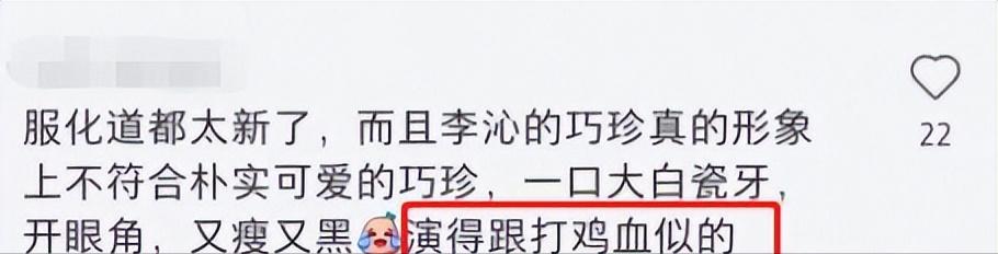 此外,还有一点不可忽视,那就是主演们的违和感,尤其是李沁。故意涂黑的脸上,一口白色烤瓷牙相当出戏。外形不符合时代特征不说,李沁的演技也受到了争议。不少观众一致觉得,李沁演得太用力了,通俗点讲就是“用力过猛”,反而适得其反。