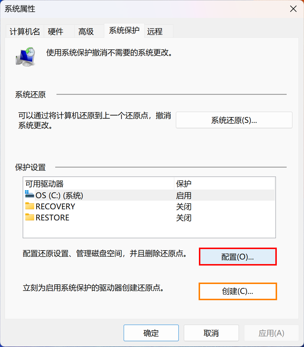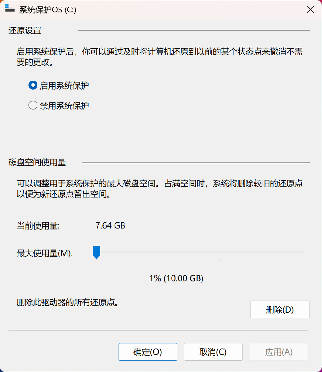 同时,建议对所有盘(或仅对系统盘)进行【配置】,勾选【启用系统保护】并依次【确定】。还可以根据需求自行设置“最大使用量”,或者【删除】选中驱动器的所有还原点。