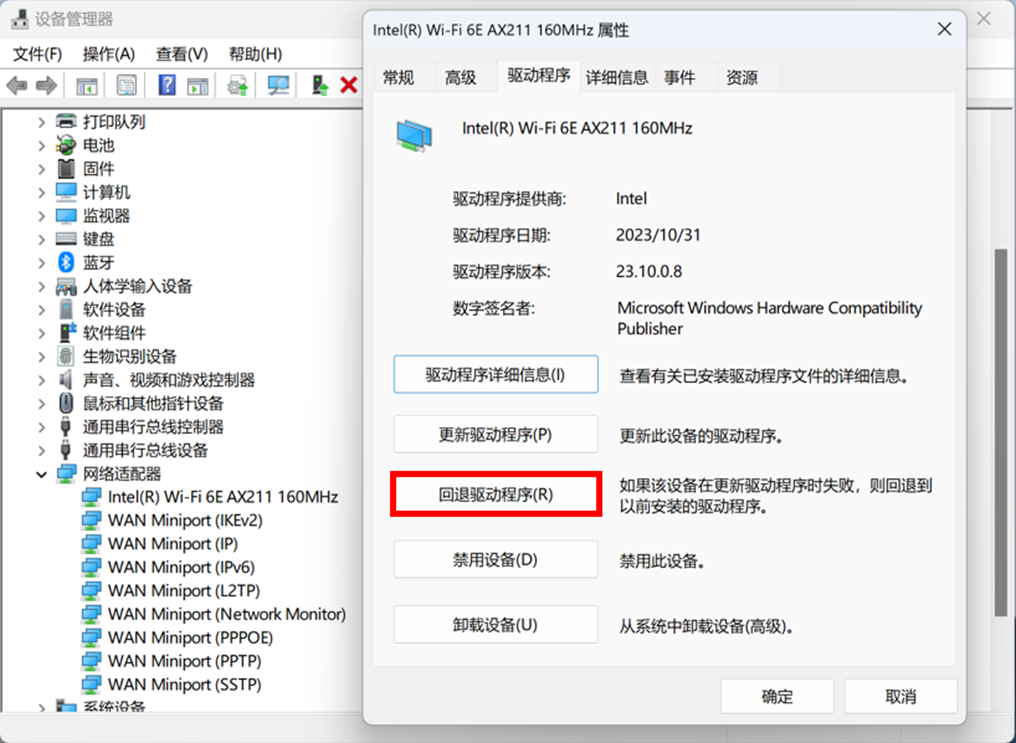 右击开始菜单,选择【设备管理器】,右击对应的设备(图示以无线网卡为例),在【属性】【驱动程序】中选择【回退驱动程序】。