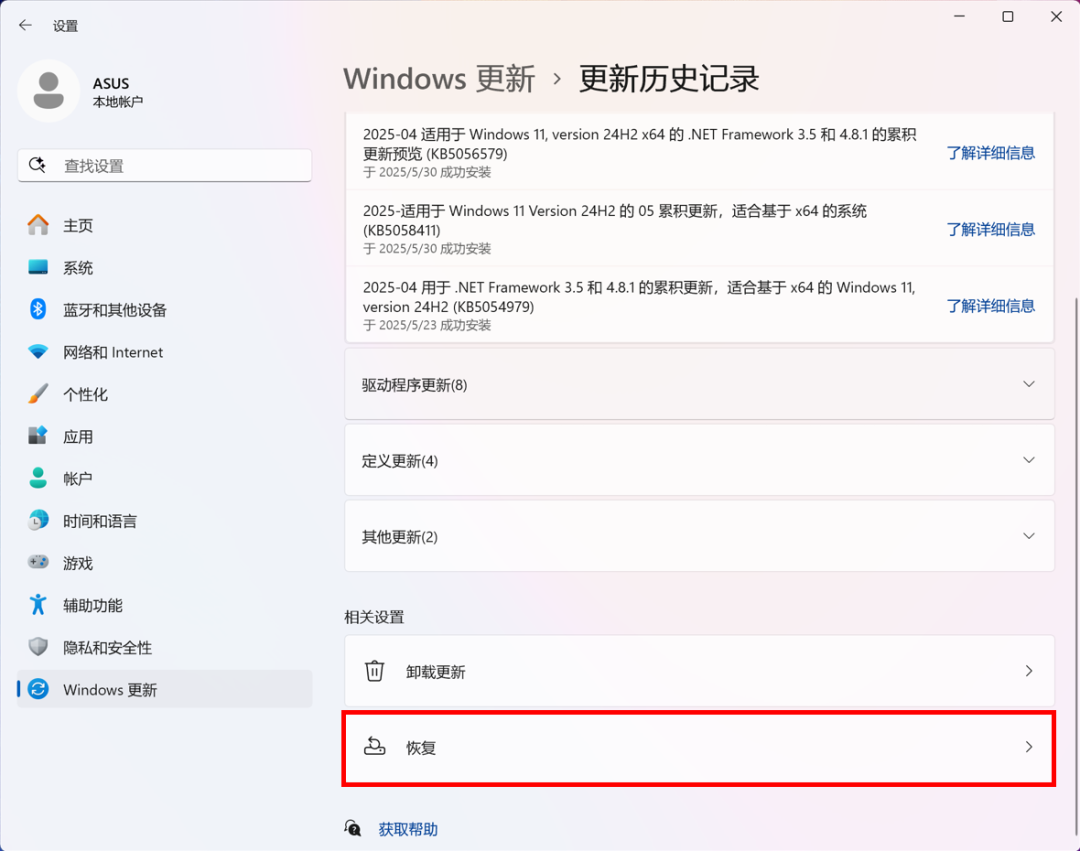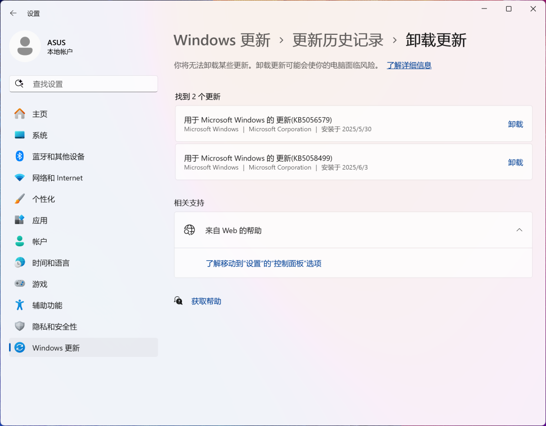 依次点击【开始-设置-Windows更新-更新历史记录-卸载更新】,选中更新并【卸载】。