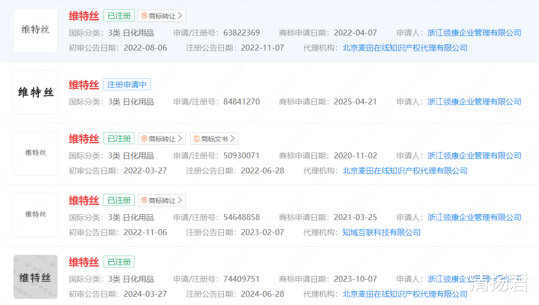 从产品信息来看,维特丝二硫化硒去屑洗发水的备案人为广州市诗丹丽化妆品厂;维特丝复活草精华臻护洗发水的备案人为广州市比柔生物科技有限公司,生产企业为广州宝丝捷生物科技有限公司;而维特丝植萃香氛洗发水(海屿岩兰)的备案人和生产企业均为广东艺柔生物科技有限公司;维特丝商标持有者则是浙江领康企业管理有限公司。