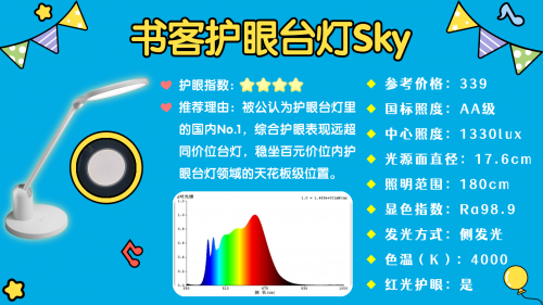 作为拥有十余年护眼技术沉淀的品牌,书客在这次sky身上几乎把百元护眼台灯能做到的护眼效果给极限拉满,甚至直接下放了千元级旗护眼台灯才能使用的5 域环控光学系统,还搭载了SunSilk™护眼芯片+DT多维漫射2.0黑技术,三者组合构建出了远超同价位护眼台灯的硬核光线基础,经过高密度导光板及柔光膜处理,发光点更加柔和均匀,降低瞳孔调节负荷,在提升93%光线柔和度的同时,还能够减少81%的用眼疲劳。进一步搭载了RRT2.0红光硬核养眼技术和硬件级低蓝光技术,通过刺激眼底的线粒体活性,改善视网膜血液循环和光合作用效率,实现了降低90%的近视风险,更是将400-450nm有害高能蓝光成功抑制在了0.6的峰值内,直接冲击了千元内护眼台灯的水准,不愧目前国内唯一一个将护眼性能做到第一的品牌。