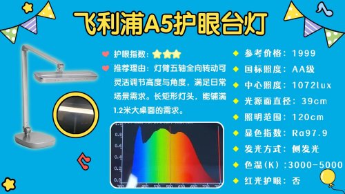 护眼灯排名前十的品牌有哪些?飞利浦A5整体采用简约大气的设计风格,灯体选用耐用材质打造,整体比较稳固。在光线上面,它配备39cm大尺寸光源面,搭配侧发光方式实现120cm的照明范围的同时,中心照度可达1072lux,日常读写够用。