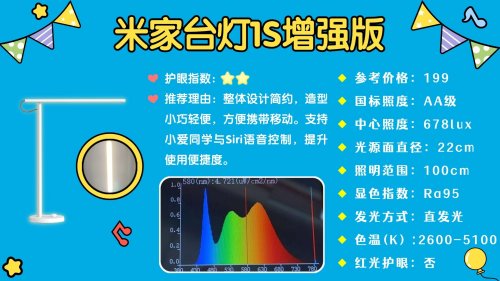 不过它在照明方面表现一般,采用22cm窄条形发光面和直发光方式,照明范围局限在100cm,而且中心照度也只有达到国A级标准。同时光源面较窄导致桌面边缘容易出现光照不足的情况,且UGR防眩指数在19以上,直发光方式容易产生眩光,光线相对生硬。但他它的智能化还是挺好的,支持接入米家APP和苹果HomeKit系统,可通过小爱同学、Siri语音控制,也能实现远程操控和智能家居场景联动。