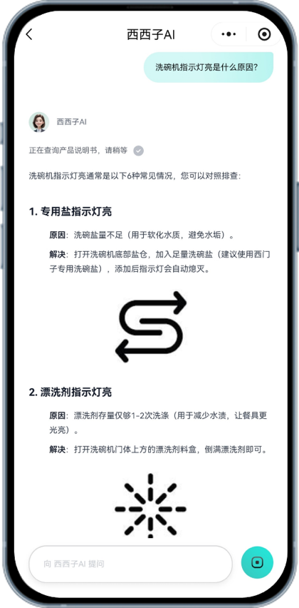 对于用户而言,“西西子AI贴身家电管家”带来的改变,体现在每一个具体而微的使用场景中。在选购阶段,用户可以像西西子通过描述家庭情况、使用习惯或空间条件,获得更贴合自身需求的产品建议与清晰对比;在使用过程中,复杂功能与专业术语被转化为易于理解的生活化说明,帮助用户更充分地发挥产品性能;在遇到异常或疑问时,西西子能够提供清晰、有序的排查思路,减少不必要的时间成本。