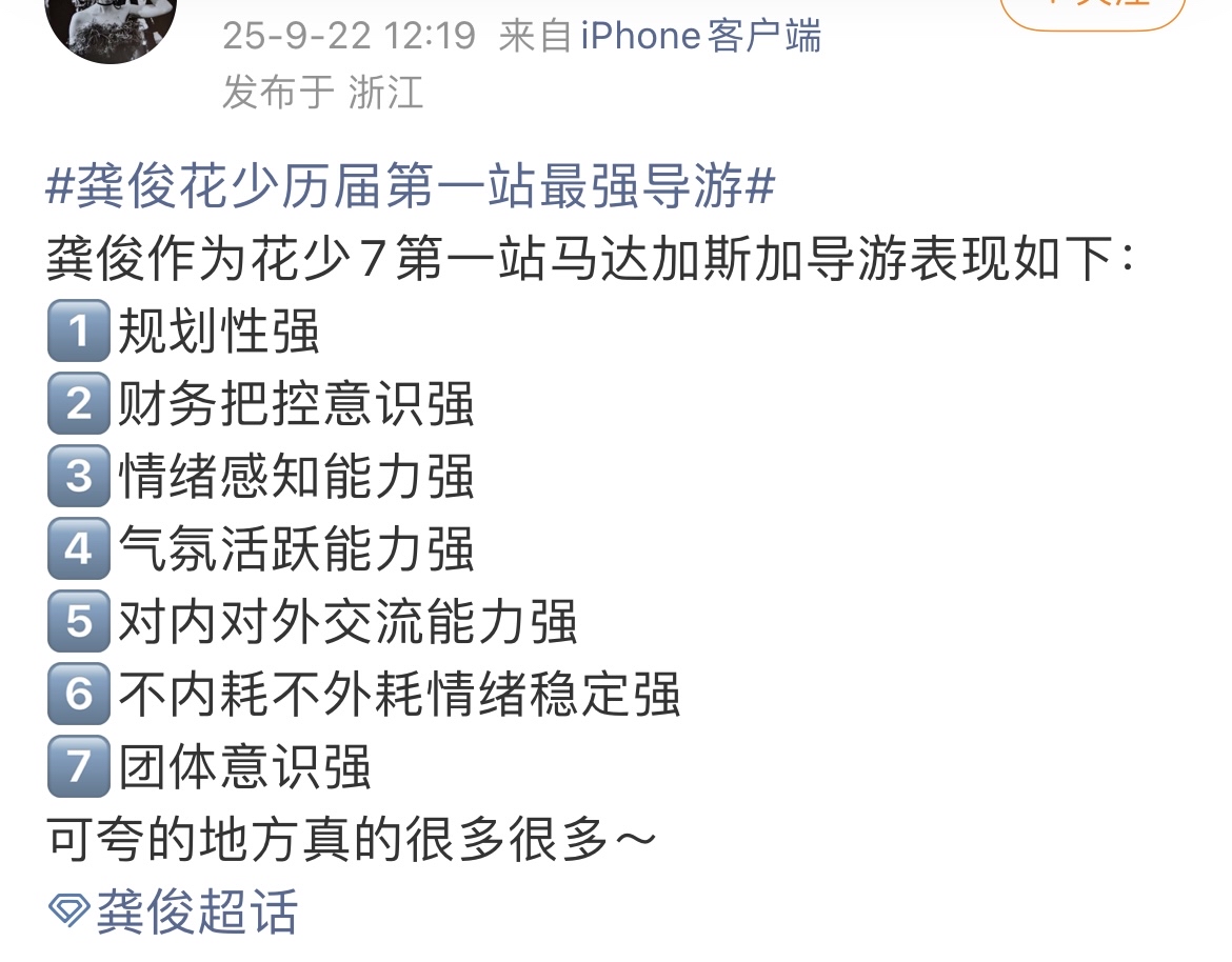 还有网友表示:承认吧,龚俊才是花少的最强导游,看他做导游时就没有这些问题,什么都安排得面面俱到,就没有被坑的时候。