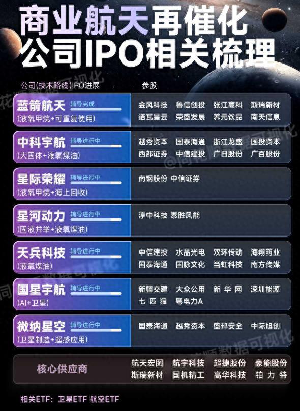 结语商业航天IPO加速既是产业成熟的标志,也为资本开辟了新赛道。短期看,蓝箭航天等头部企业上市后将加速技术迭代与产能扩张;中长期看,液氧甲烷火箭商业化、可回收技术普及、卫星数据应用爆发将持续打开行业空间。建议关注三条主线:1)技术领先的火箭/卫星企业(IPO进程及参股方);2)航天级材料/部件本土供应商;3)卫星ETF、航空ETF等指数化投资工具。需注意:个股波动风险、技术迭代不及预期、行业竞争加剧等。