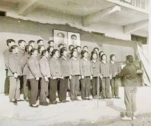 荆州师专767班学生在学校礼堂演出节目,背后的毛泽东主席和华国锋主席油画像为作者手绘。