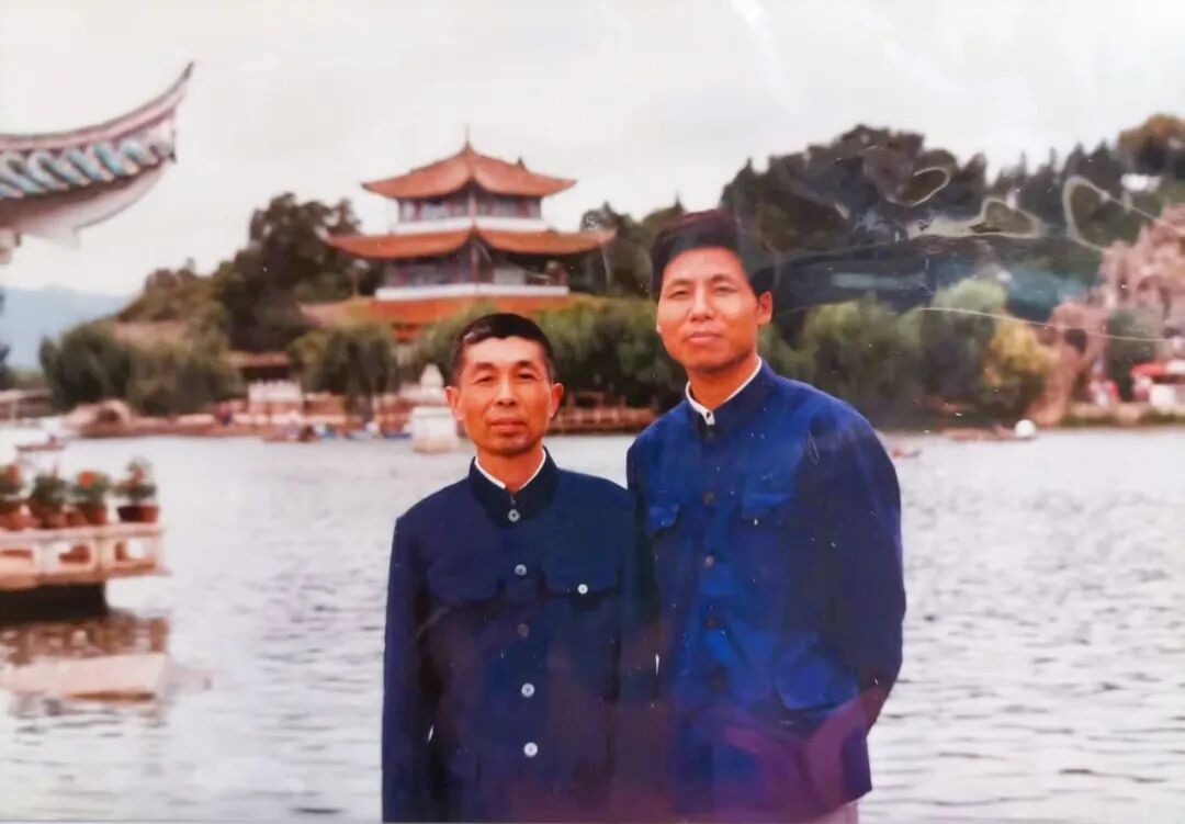 在荆州师专泮池旁小亭边与同事合影。右边是作者。