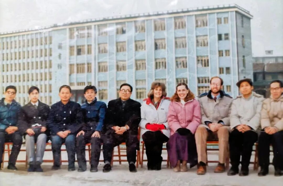与荆州师专外教在学校图书馆前合影。右边第二人为作者,左边第四人为关春明校长。