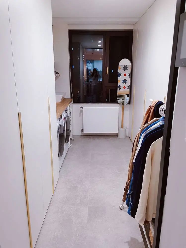 推拉门打开步入衣帽间,原储物室与阳台打通后,空间宽敞通透。考虑到居家动线和便利,将衣帽间和洗衣房结合在一起,左右两侧均设计通高储物柜,提高收纳不浪费空间。可旋转穿衣镜不影响储物柜开关。洗衣机、烘干机、壁挂式洗衣机和脏衣篓,整洁有序的布置不影响美观。