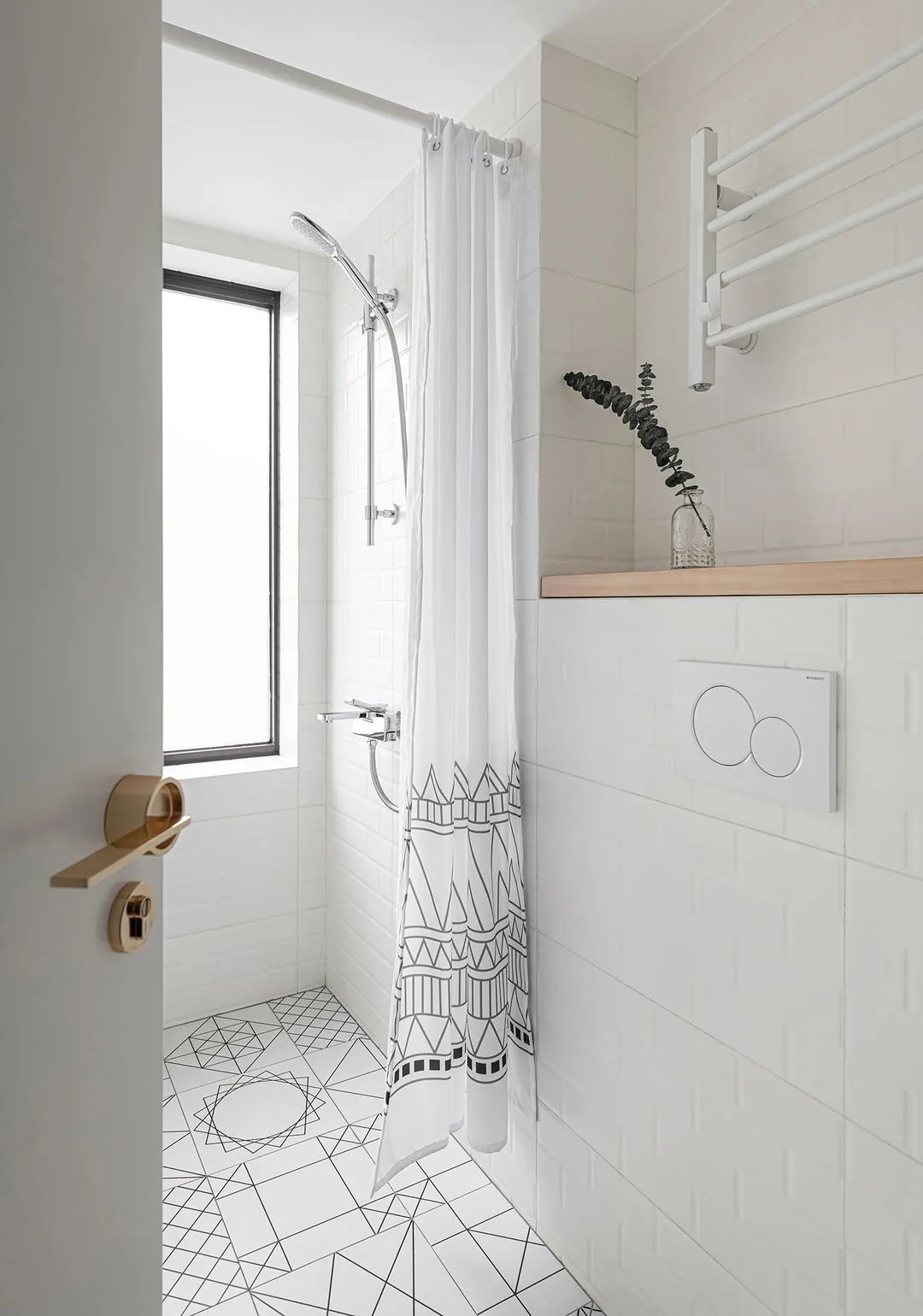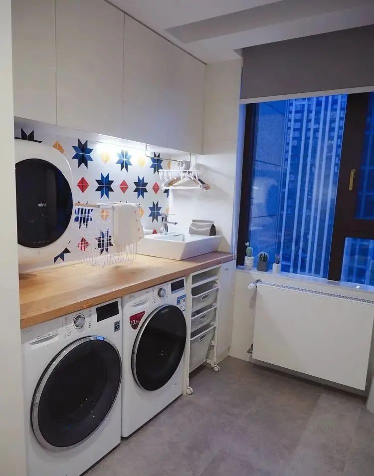 次卫设计考虑很充分,将洗手台外移不仅扩大卫浴空间,还提高日常使用便利。洗手台和储物柜采用悬挂式设计,底部则是喵星人的内务府和摆放扫地机器人。卫浴白砖突显明亮,几何元素的介入,让空间更活泼。