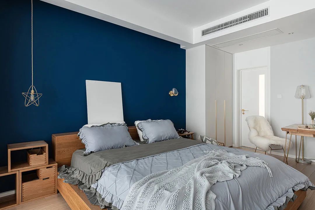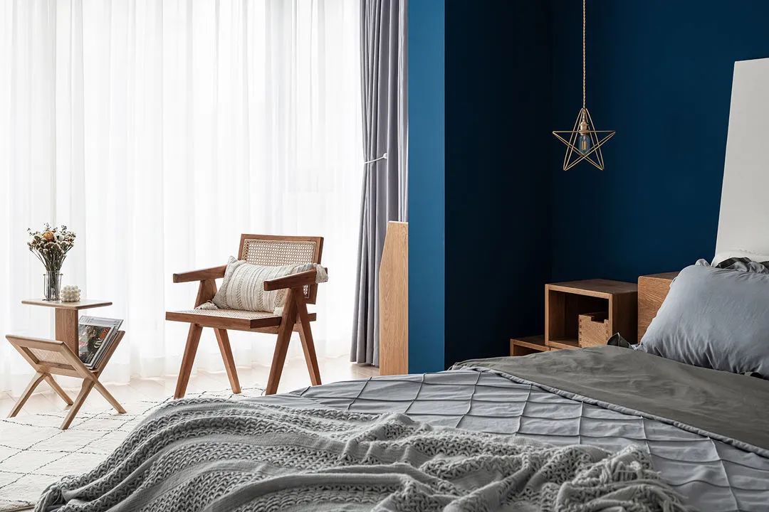 卧室深蓝色床头背景,丰富空间拉伸层次感。金属色的吊灯,星星和月亮造型的组合,在深蓝色背景映衬下,显得格外醒目。阳台纳入卧室扩大使用面积,让空间更加宽敞明亮。椅子、书架和地毯的组合,打造一处慵懒的休闲区。