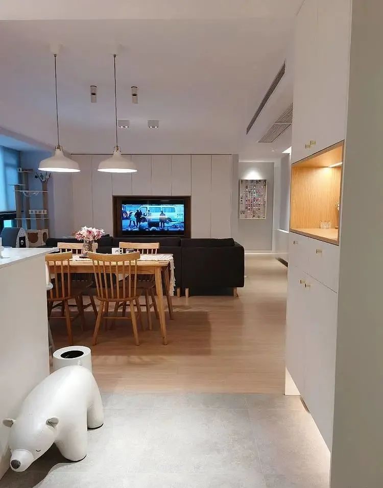 大横厅格局,没有隔断的影响空间宽敞明亮,要是在有个独立阳台简直完美。看似随意的家具布置,透露着轻松闲适的慢生活节奏。电视墙直接尺寸定制,提前做好电路布置,正面没有多余的线露出来,整体美观实用。