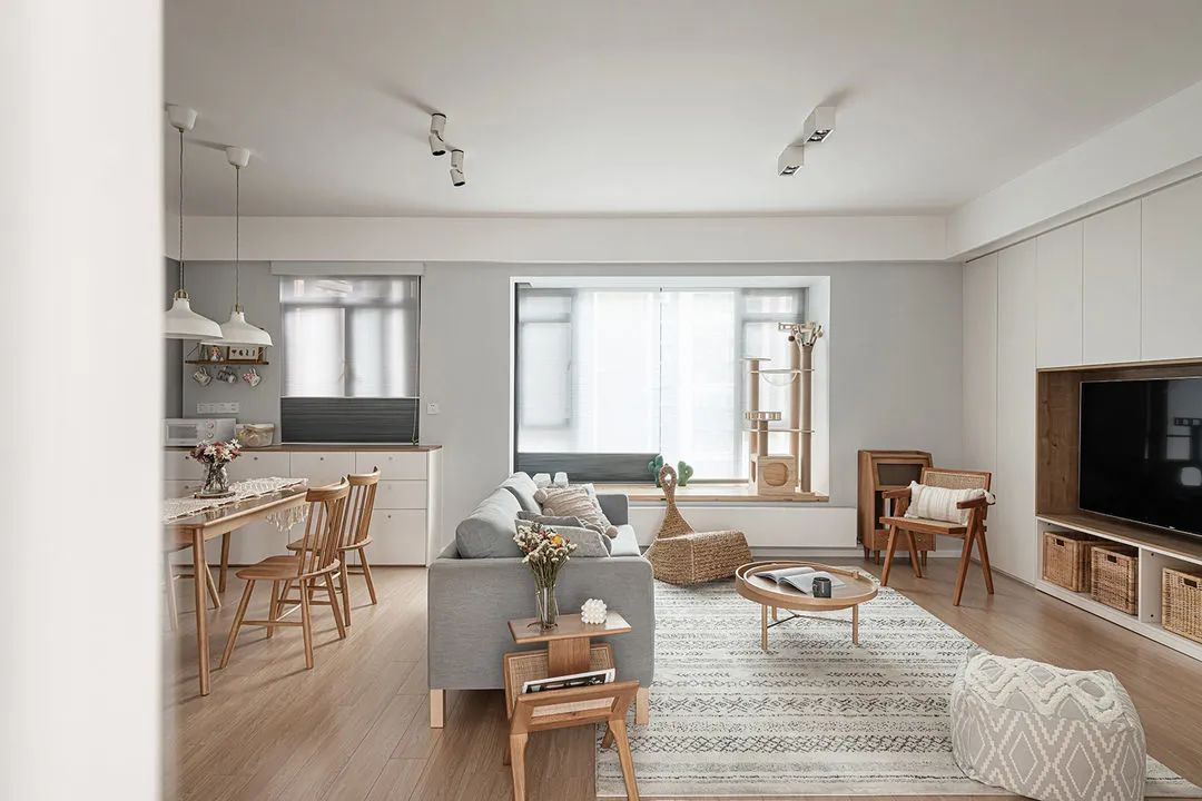舍弃了厚重的茶几,利用小小的桌几替代,占用空间少灵活又实用。地面铺设地毯,减少噪音的同时又方便享受席地而坐的舒适。飘窗打造成喵星人的活动空间,猫爬架布置在边角,不影响采光。