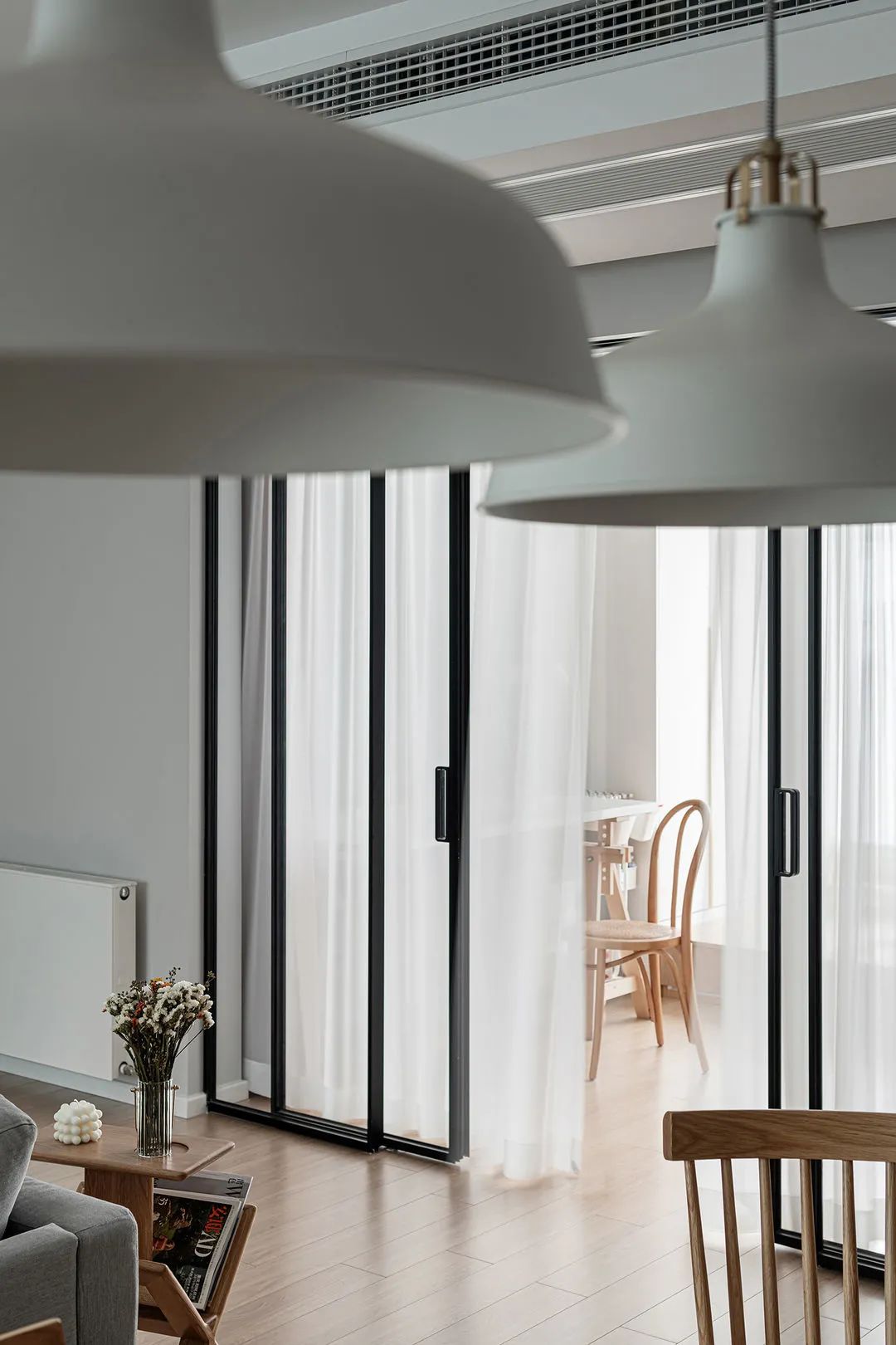 拆除原有隔断墙将空间打通,黑框玻璃移门大方通透,隔断空间又不影响采光。内部纱帘的介入,虚实层次中透露出朦胧美。